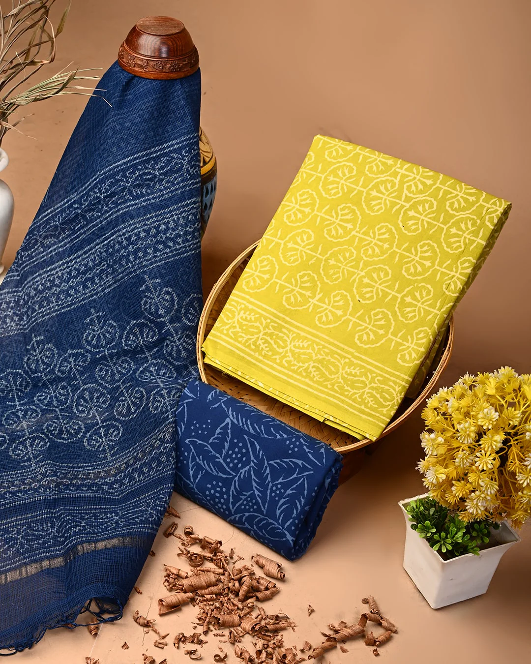 Cotton plain, simple suit design with Kota Doria dupatta printing is one of the most traditional and unique methods of fabric printing using block prints by hand, where artisans impress hand-carved wooden stamps printed with dyes onto the cloth to reveal intricate Boota, floral, booty, and geometric designs.