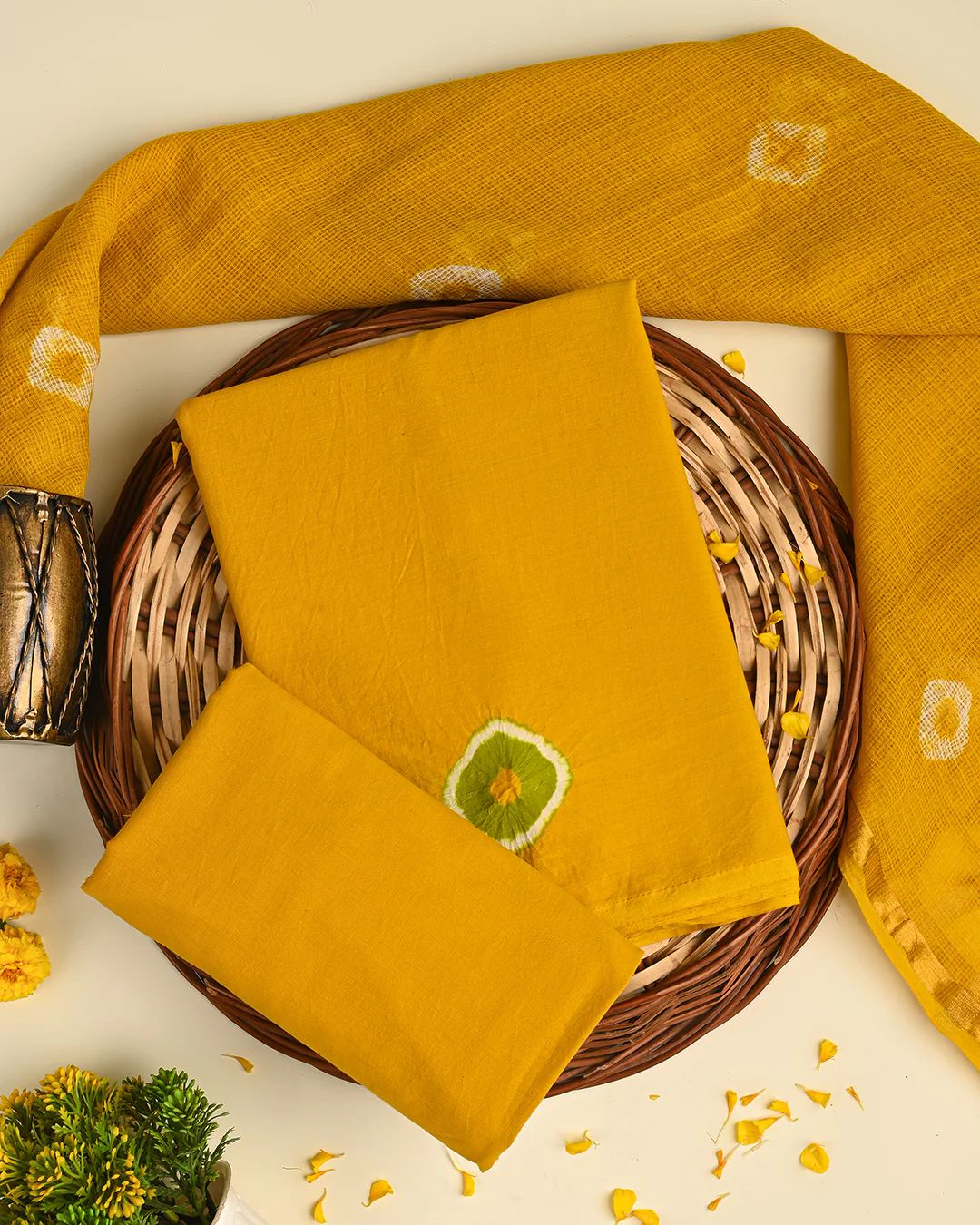 Hand-block print fabric, cotton suit with Kota Doria dupatta printing is one of the most traditional and unique methods of fabric printing using block prints by hand, where artisans impress hand-carved wooden stamps printed with dyes onto the cloth to reveal intricate boota, floral, booty, and geometric designs.