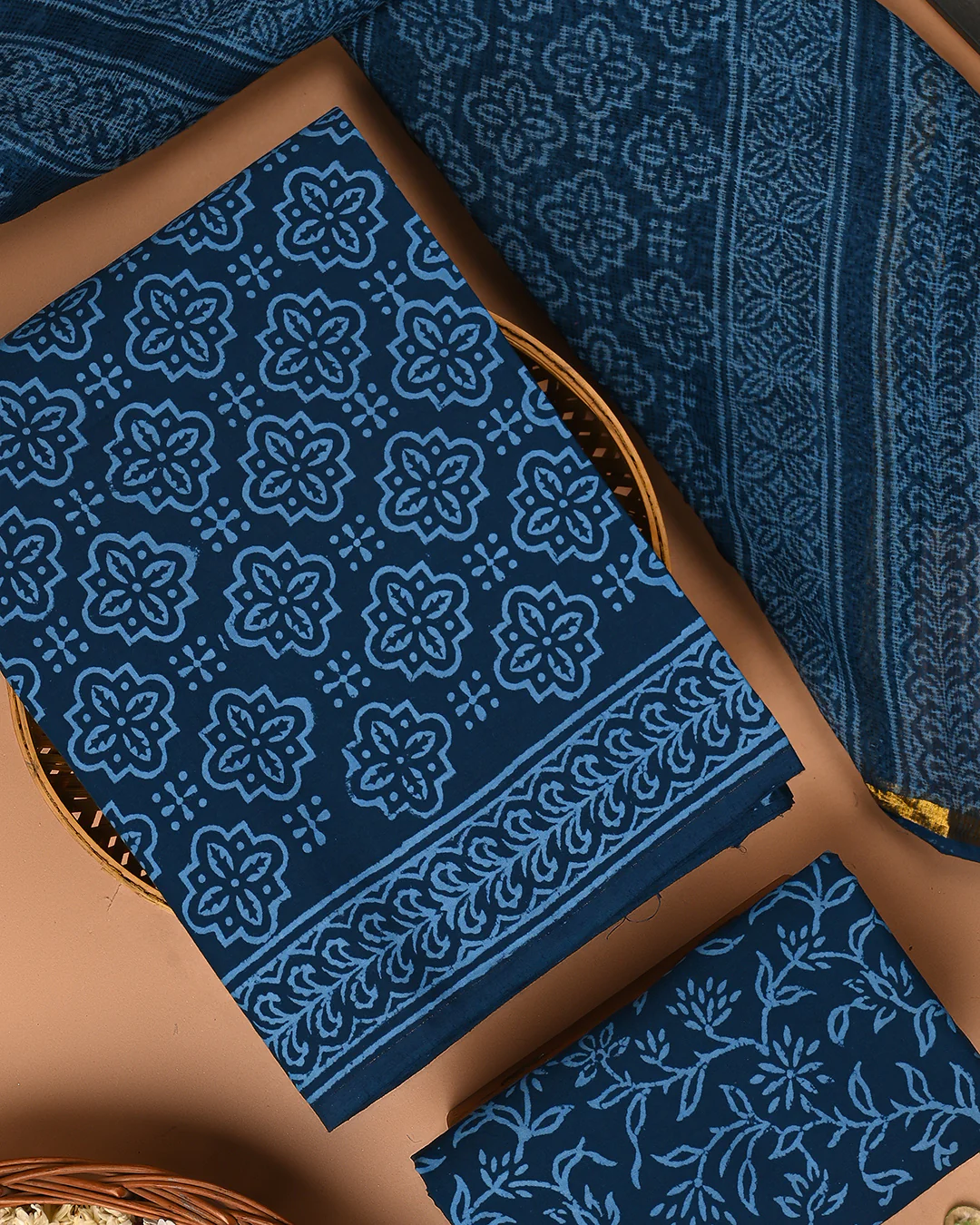 Hand-block print fabric, cotton suit with Kota Doria dupatta printing is one of the most traditional and unique methods of fabric printing using block prints by hand, where artisans impress hand-carved wooden stamps printed with dyes onto the cloth to reveal intricate boota, floral, booty, and geometric designs.