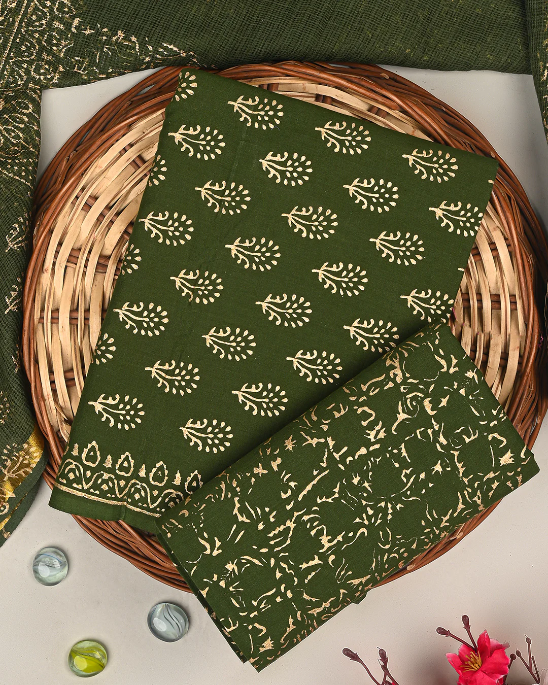 Elegant Green Gold Print Cotton Suit Sets With Kota Doria Dupatta (BSCOTKO75)